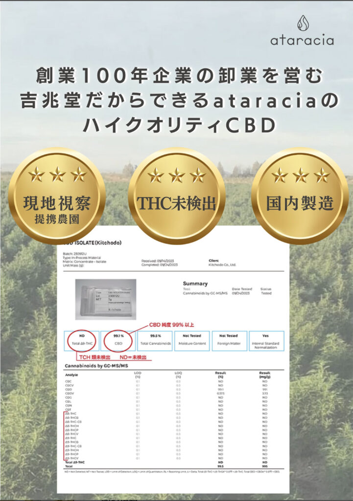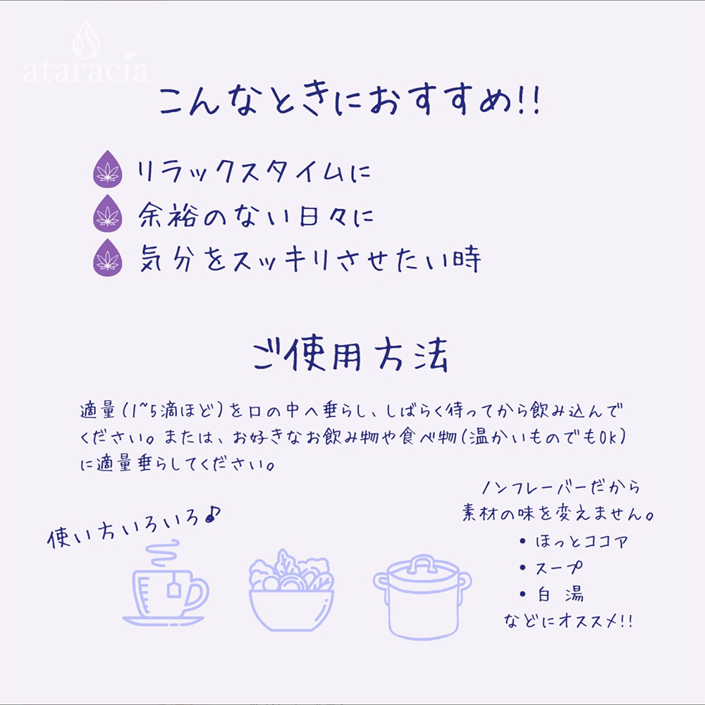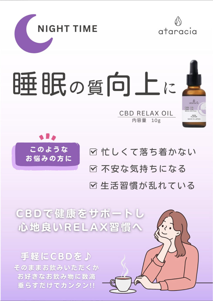 RELAX OIL CBD リラックスオイルataracia CBD 5% CBN 5%ディスティレート500mg内なる静けさを広げ、心を満たし夢心地へと誘う 植物油MCTとCBD含有濃度が高いヘンプエキス(ディスティレート)とCBNを合わせた、ataracia CBDオイル。自然の力で心と体をリラックスさせる、ataracia CBDリラックスオイル。CBDとCBNを配合したこのオイルは、ストレスや不安を和らげ、リラックスした状態に導きます。CBDは大麻の成分の一つでありながら、心地よいリラックス効果があります。また、CBNはリラックス効果を高める働きがあり、より一層のリラックス効果を実感できます。この組み合わせにより、心身の緊張を解きほぐし、穏やかな心地よさをもたらします。ataraciaは、厳選された原材料を使用し、徹底的な品質管理のもとで製造されています。安心してお使いいただけるように、第三者機関での検査も実施しております。日々の忙しい生活やストレスによって疲れた心と体に、ataracia CBDリラックスオイルで癒しのひとときを提供してみてはいかがでしょうか。【お召し上がり方】適量をそのまま舌に垂らし、しばらく待ってから飲み込んでください。お好きなお飲みものに入れたりサラダなどにかけるのもおすすめです。 商品情報ブランド名ataracia内容量 10g原材料中鎖脂肪酸油(国内製造)、麻抽出物(CBD・CBN含む)賞味期限2025年10月保存方法直射日光や高温多湿を避け、冷暗所に必ず立てた状態で保存してください。開封後は冷蔵庫保栄養成分表示エネルギー:90kcalタンパク質:0g脂質:10g炭水化物:0食塩相当量:0gカンナビジオール 500mgカンナビノール 500mg使用上の注意・幼児の手の届かないところで保管してください。・体調や体質によって体にあわない場合は使用を中止してください。・CBDの性質上、変色する場合がございますが、ご使用に問題はありません。・未成年については保護者の同意を得ることを推奨します。・妊娠中授乳中はご使用をお控えください。・体質や健康状態によっては医師や専門家にご相談ください。製造国日本製造販売元株式会社 吉兆堂 商品番号:relax_oil ataracia CBDリラックスオイル CBD リラックスオイル 10g 在庫状態:〇 ¥6,945(税別) ( 税込¥7,501 ) 数量