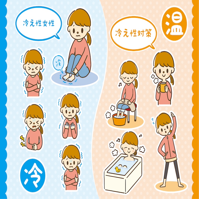 冷えには個人差がありますが、運動によって筋肉量を増やす、体を温める食材の積極的な摂取、ゆっくりと湯船につかった入浴をするなど、生活習慣の改善を行なうことが必要です。「冷えは万病の元」とも言われ、不調の原因にもなります。